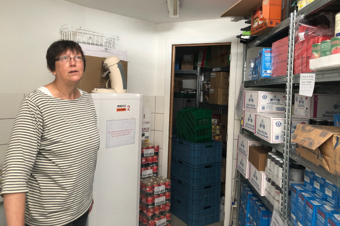 Notre guide pour la journée est Jean-René Thonard, dynamique membre de la commission régionale d’Action Vivre Ensemble et de la commission spéciales inondations. A chaque arrêt, nos interlocuteurs nous montrent la trace laissée par l’eau sur les briques et indiquant le niveau atteint par les inondations. Première étape à la maison Saint Vincent de Paul à Pepinster. « Certaines familles ne peuvent encore aujourd’hui ni congeler ni cuire certains aliments proposés. Il faut alors pouvoir adapter l’offre » commente le président. L’ atelier cuisine et la distribution des colis alimentaires nous sont présentés par d’infatigables volontaires qui ont encore trouvé le ressort et l’énergie de se mobiliser également pour l’Ukraine.