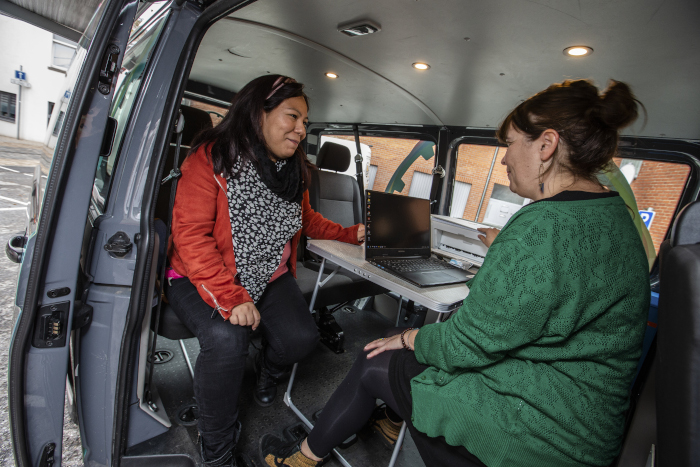 « Une AMO bruxelloise trouve son public en sortant dans la rue ; mais, dans nos communes, la précarité est plus cachée, au fin fond des villages. Il n’y a plus de gare, pas de services de proximité, il y a deux bus par jour : ces gens ne peuvent même pas se déplacer pour venir dans nos bureaux, même pour venir chercher chez nous 2 kg de pâtes pour finir le mois. Nos bureaux de Ciney ne répondent pas aux besoins. Une AMO doit rencontrer les publics, dans les villages, dans les cités sociales. C’est pourquoi nous avons créé ce bureau mobile. Nous sommes aidés par Action Vivre Ensemble mais nous n’avons pas de subside public : l’idée est de montrer d’abord que cela fonctionne avant de demander la création d’une antenne mobile. »